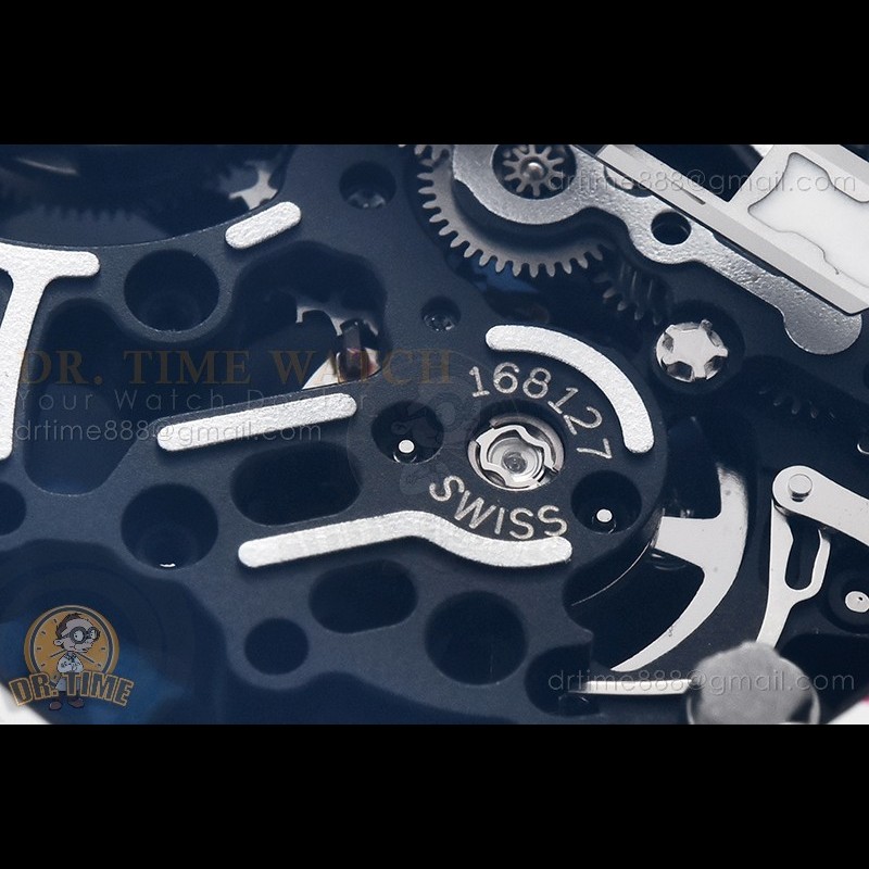 Size:49mm x 42.7mm x 13.5mmMovement:Clone RMUL2 Manual Movement Functions:Hours, Minutes, SecondsCase:Genuine NPNT Quality Case with White Crown Crystal:Sapphire Crystal with Purple AR Coating (Similar to Genuine) Dial:Custom Skeletonal Dial with White Inner Bezel Rehaut Bezel:NTPT Bezel Strap:White Rubber Strap Clasp:Foldover Buckle Water resistance:30...