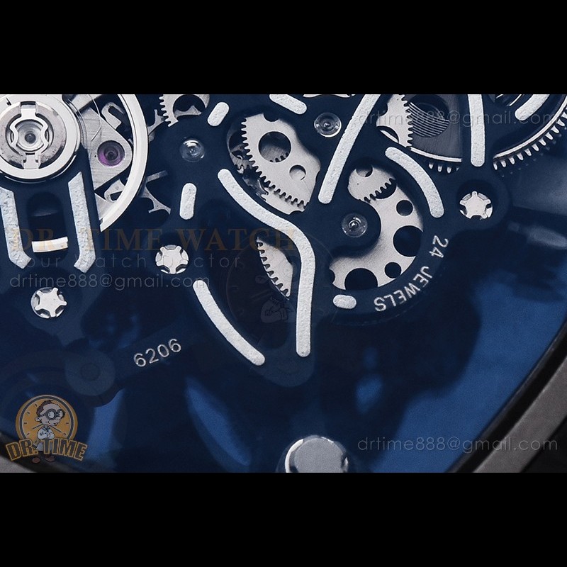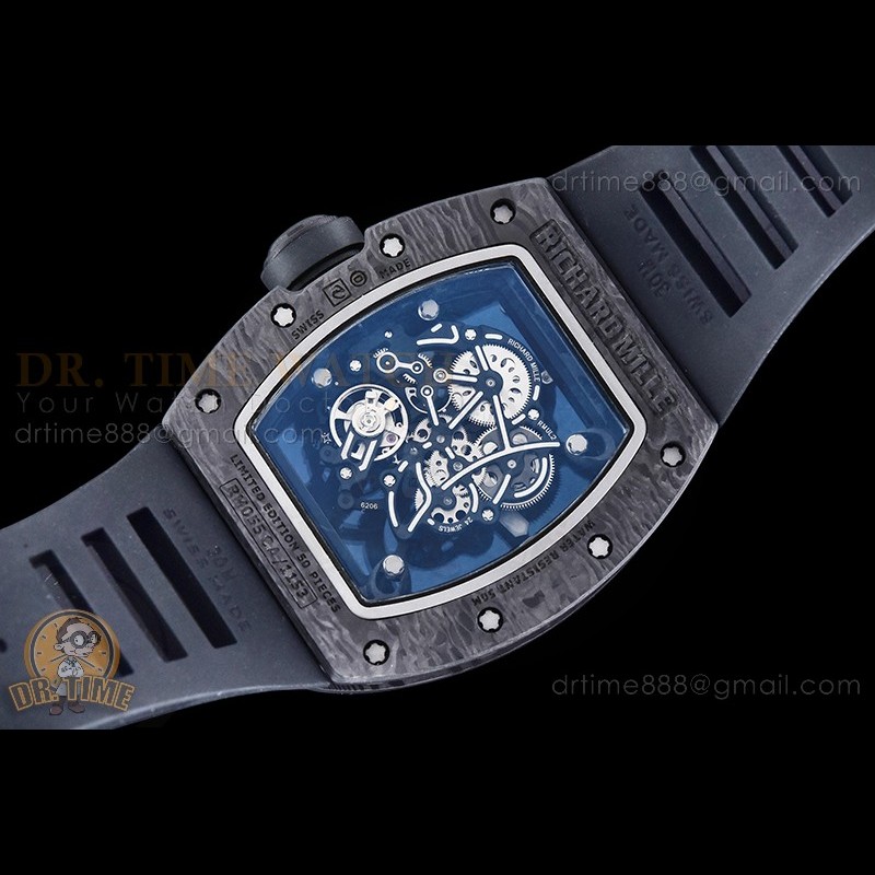 Size:44.5mm x 50mm x 16.5mmMovement:Asian Handwind Skeleton Tourbillon Movement with modified bridges/plates Functions:Hours, MinutesCase:Full Carbon Case Crystal:Sapphire Crystal (with Light Swiss Grade AR coat) Dial:Custom Skeleton Dial with Inner Blue Bezel Bezel:Full Carbon Bezel Strap:Blue Rubber StrapClasp:Deployant BuckleWater...