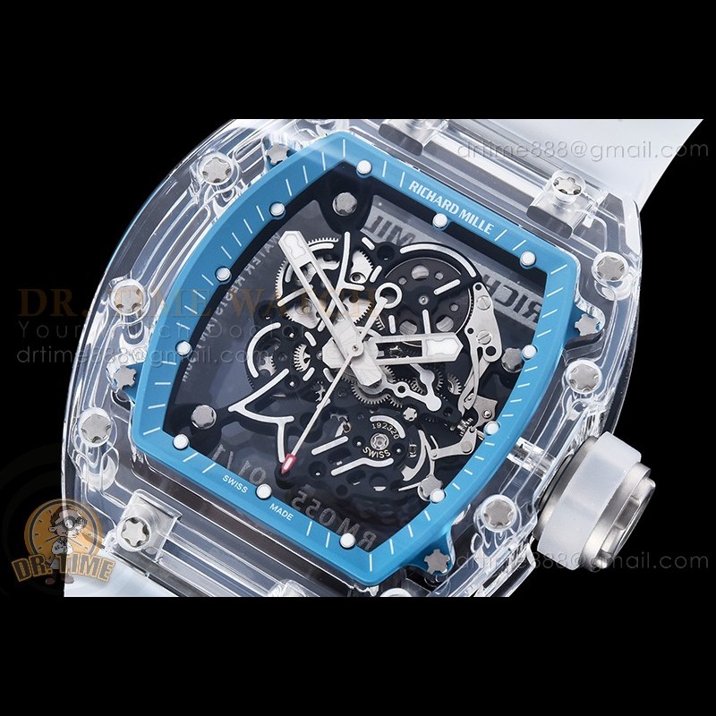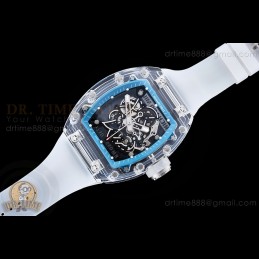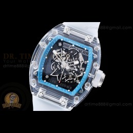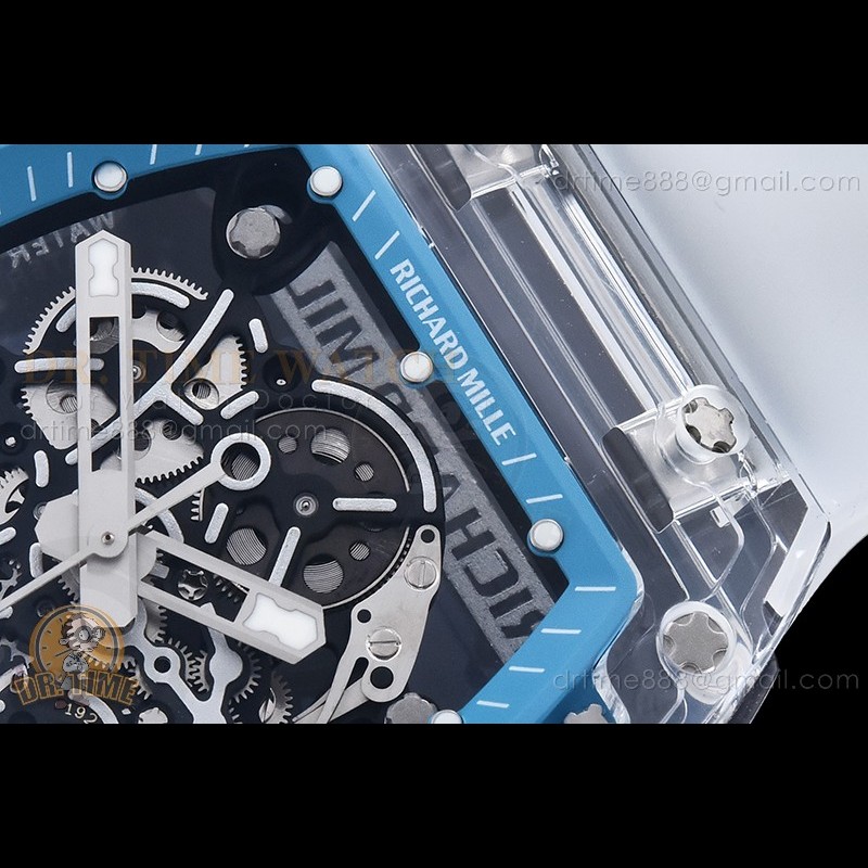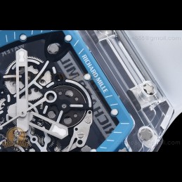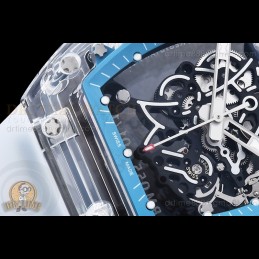 Size:50mm x 43mm x 17mmMovement:Clone RMUL3 Manual Movement with Upgraded Clear Jewel Functions:Hours, Minutes, SecondsCase:Genuine NPNT Quality Case with Blue Crown Crystal:Sapphire Crystal with Purple AR Coating (Similar to Genuine) Dial:Custom Skeletonal Dial with Correct Transparent Incabloc Diamond, "RM35-01 Rafa" Marking and Black Inner Bezel Rehaut...