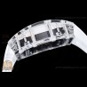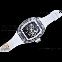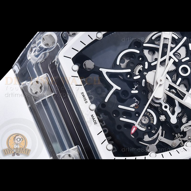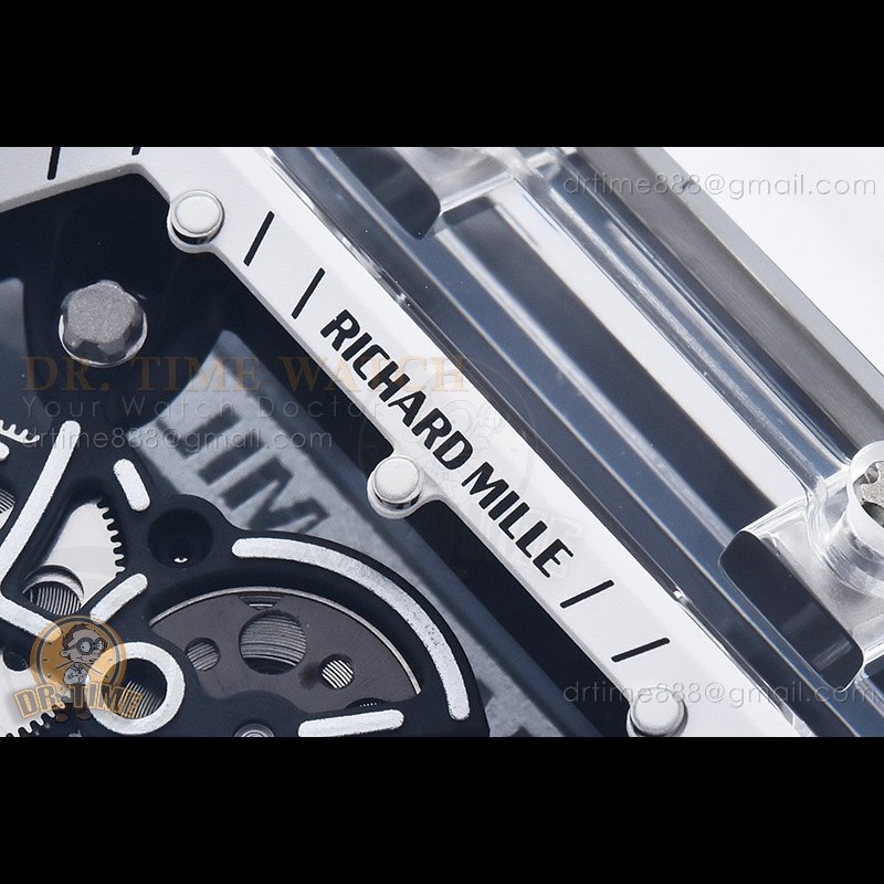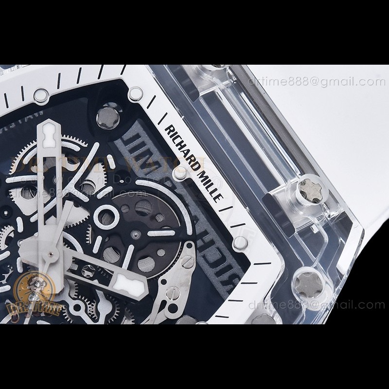 Size:49.9mm x 42.7mm x 13.5mmMovement:Clone RMUL2 Manual Movement Functions:Hours, Minutes, SecondsCase:White Ceramic Case Crystal:Sapphire Crystal with Purple AR Coating (Similar to Genuine) Dial:Custom Skeletonal Dial with Black Inner Bezel Rehaut Bezel:White Ceramic Bezel Strap:White Rubber Strap Clasp:Foldover Buckle Water resistance:30mWaterproofing...