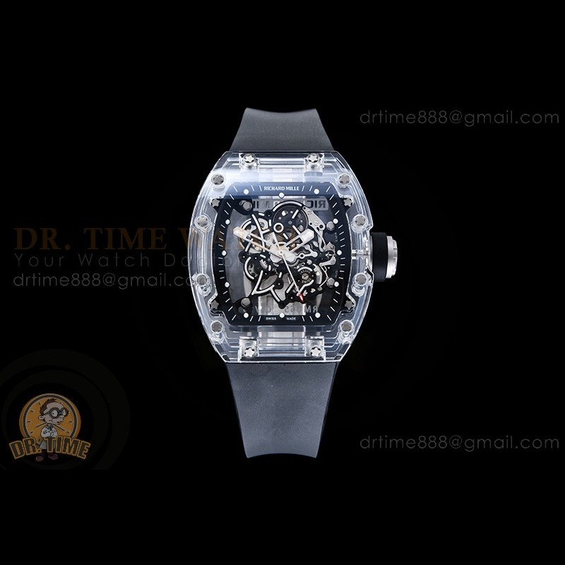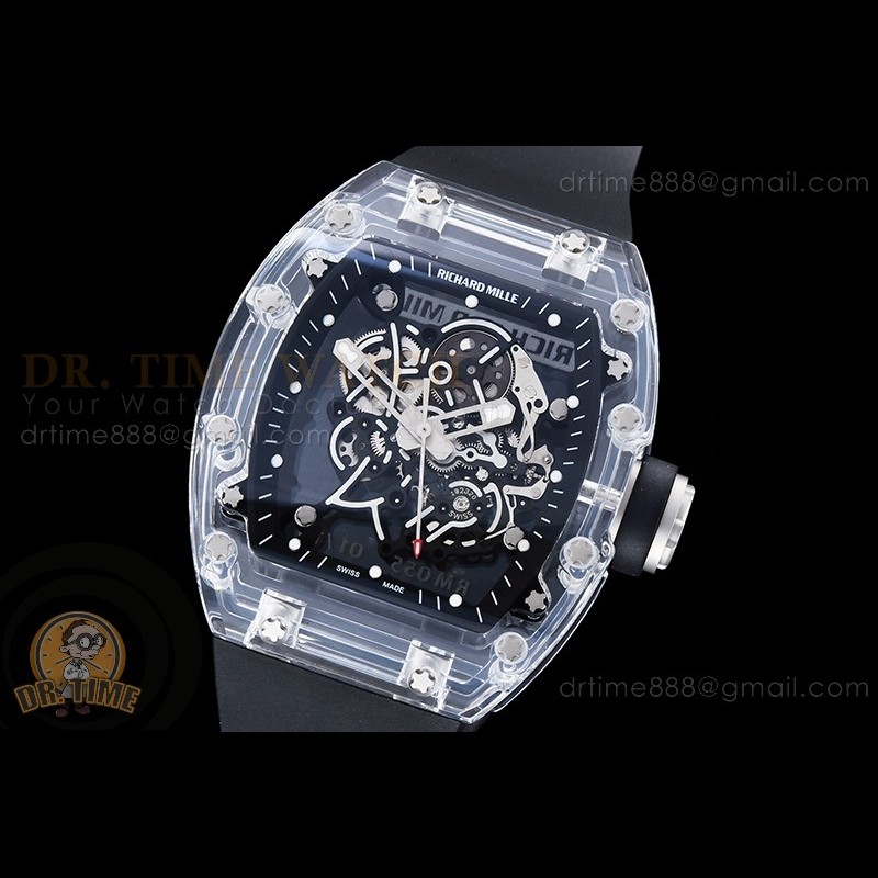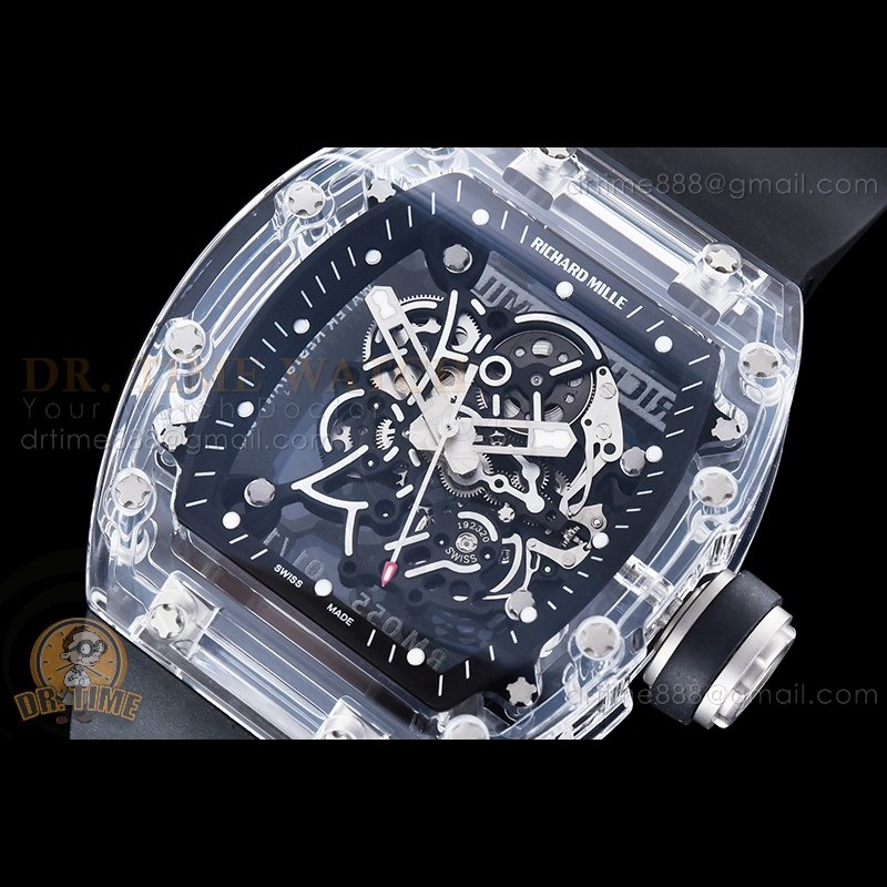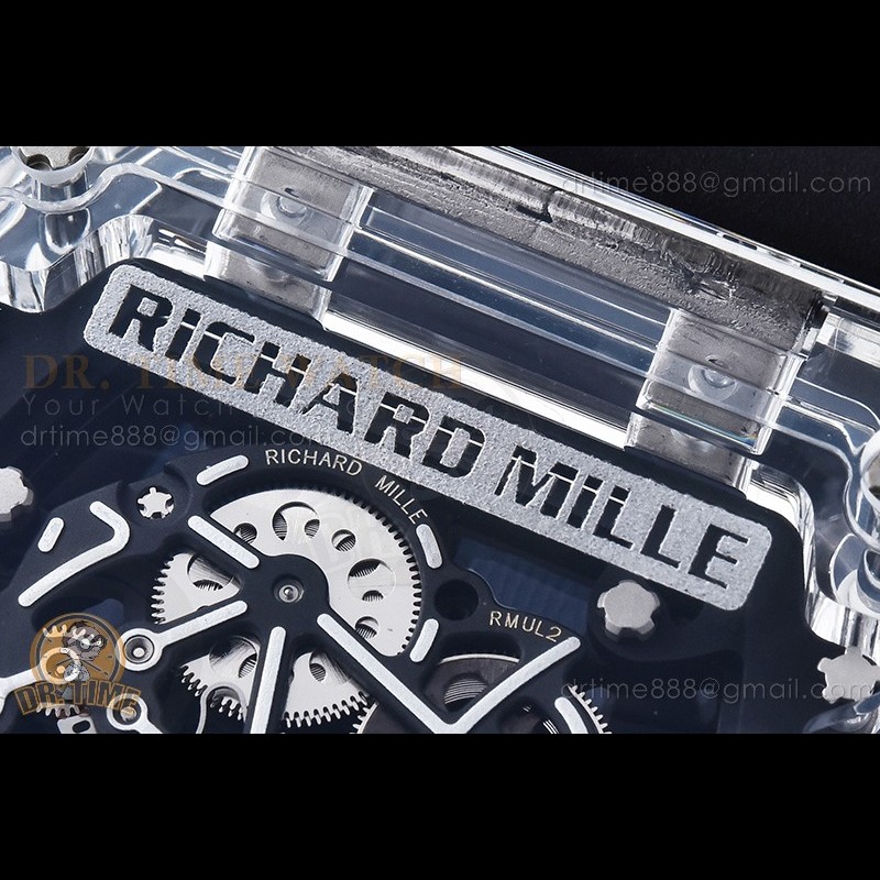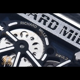 Size:49.9mm x 42.7mm x 14mmMovement:RMUL2 1:1 Superclone Manual Handwind Movement like Genuine Functions:Hours, Minutes, SecondsCase:Genuine NTPT Quality Case with Black Crown Crystal:Sapphire Crystal with Purple AR Coating (Similar to Genuine) Dial:Custom Skeletonal Dial with White Inner Bezel Rehaut (Red Words) Bezel:NTPT Bezel Strap:Black Rubber Strap...