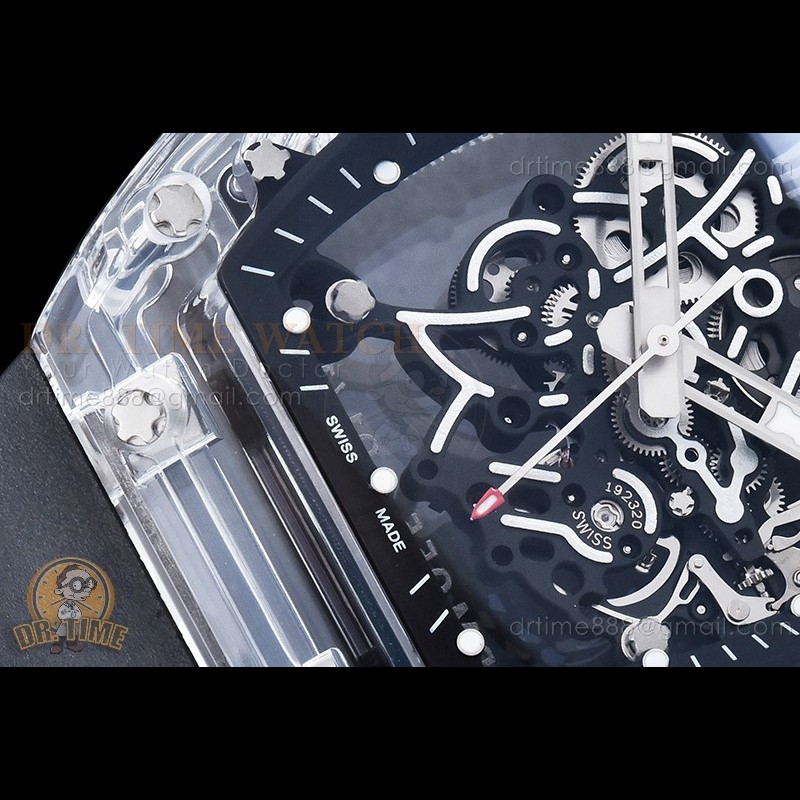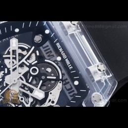 Size:50mm x 43mm x 17mmMovement:Clone RMUL3 Manual Movement with Upgraded Clear Jewel Functions:Hours, Minutes, SecondsCase:Genuine NPNT Quality Case with Red Crown Crystal:Sapphire Crystal with Purple AR Coating (Similar to Genuine) Dial:Custom Skeletonal Dial with Correct Transparent Incabloc Diamond, "RM35-01 Rafa" Marking and Black Inner Bezel Rehaut...